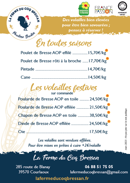 Vous y trouverez toute l’année des Poulets de Bresse effilés. Sur demande je peux vous préparer la volaille en « prête à cuire »; il ne vous restera plus qu’à la mettre au four et à la savourer !